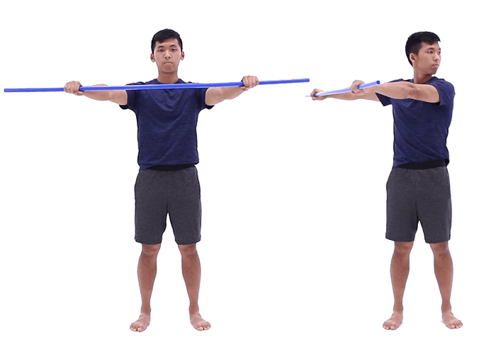 Start by standing up straight holding a dowel down in front of you with both arms straight. Raise both arms up to shoulder height and rotate your arms and torso over to one side while simultaneously rotating your head over to the other side until you feel a stretch in your neck. Hold for 30 seconds and repeat.
