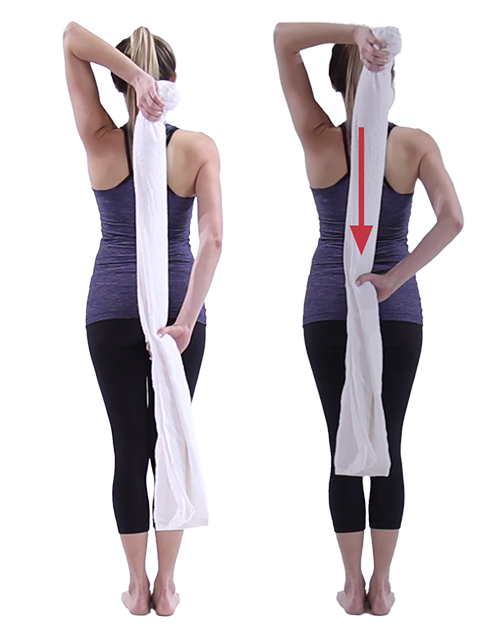 Start by standing up straight holding one end of a towel on the side you want to stretch. Sling the towel over your shoulder so that your elbow is above your head and your upper arm is by your ear. Grab the bottom end of the towel with your other hand and gently pull down and back allowing your working shoulder to rotate back slightly. Hold for 30 seconds.