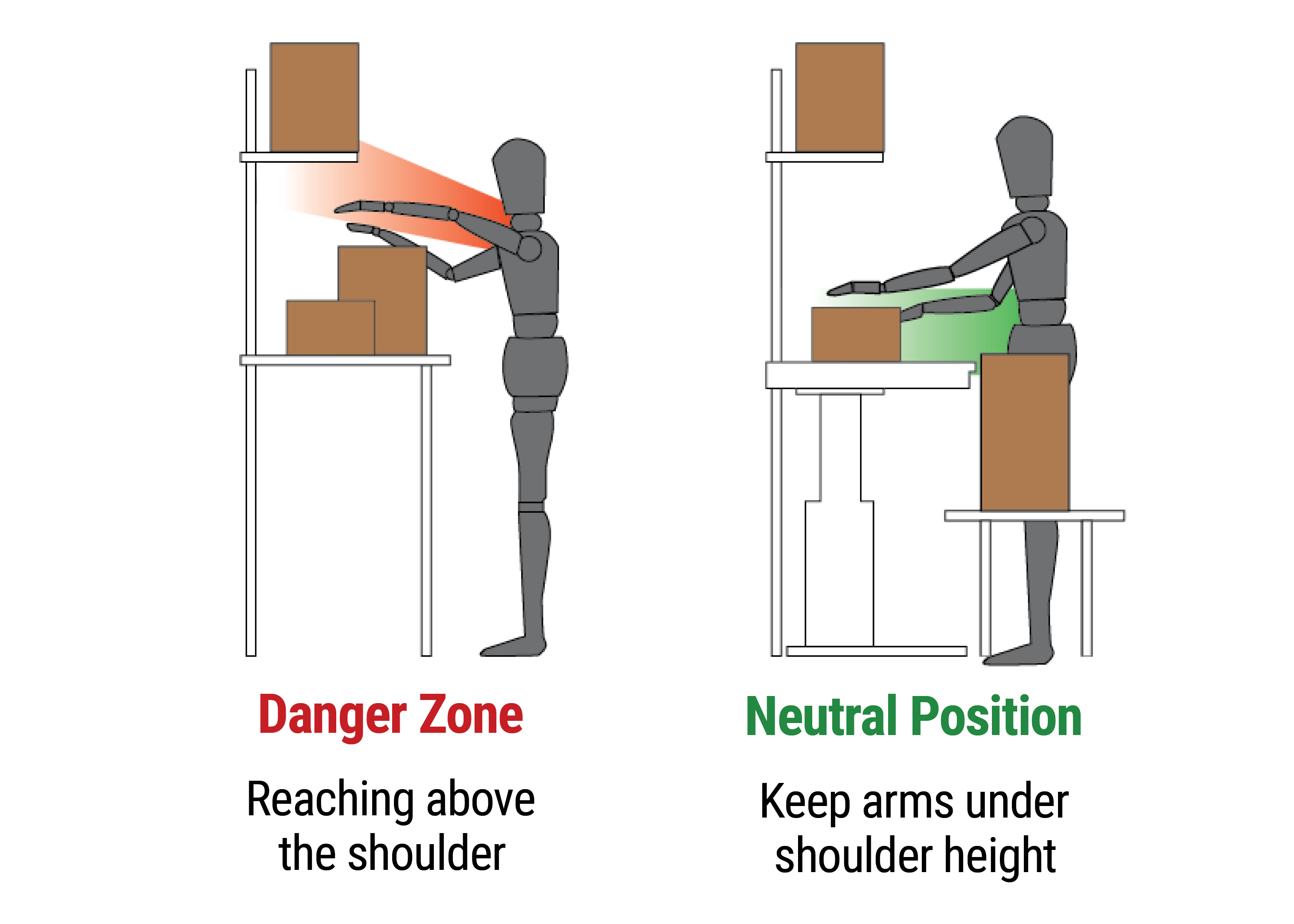 • Avoid reaching far over your shoulder. Instead, use positioning devices (like a forklift) to bring the items right in front of you.