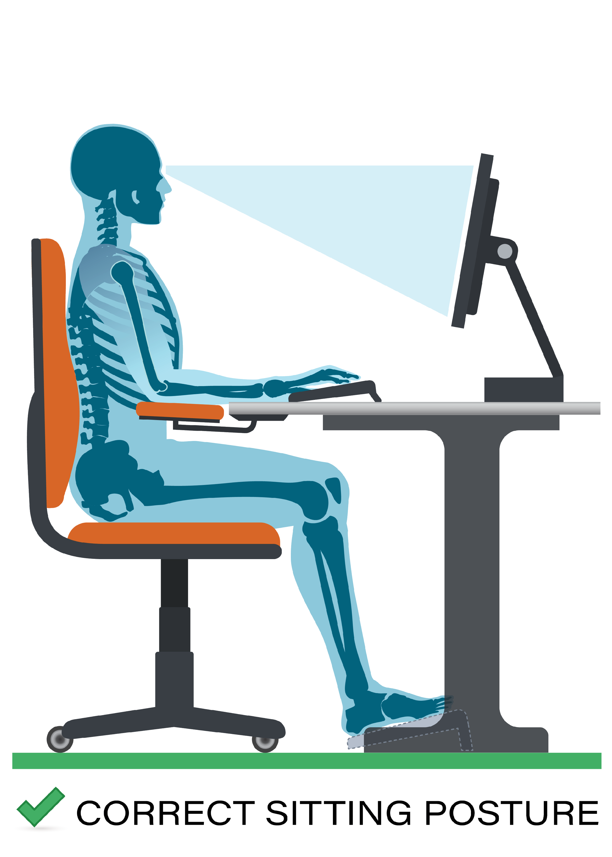 • Adjust the height of your desk and chair to ensure your elbows are bent at a 90-degree angle.